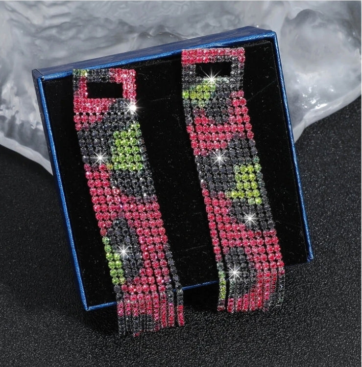 These Rhinestone Dangling Earrings are a must have! A beautiful mix of multi-colored rhinestones creates stunning random dalmatian pattern that sparkles like a beautiful chandelier.
